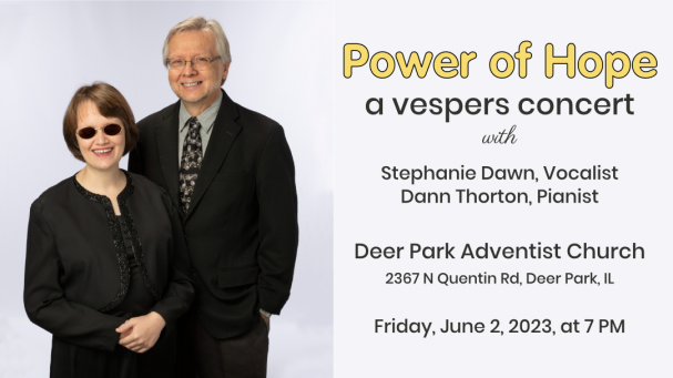 Please join the Power of Hope - a Vespers Concert, on Friday, June 2, at 7 PM, at the Deer Park Seventh-day Adventist Church located at 2367 N Quentin Rd, Palatine, IL 60074, featuring singer Stephanie Dawn & pianist Dann Thornton.
